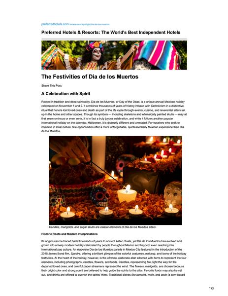 Preferred Hotels & Resorts: Where Next? • September 2024 The Festivities of Dia de los Muertos | Preferred Hotels & Resorts Rooted in tradition and deep spirituality, Dia de los Muertos, or Day of the Dead, is a unique annual Mexican holiday celebrated on November 1 and 2.